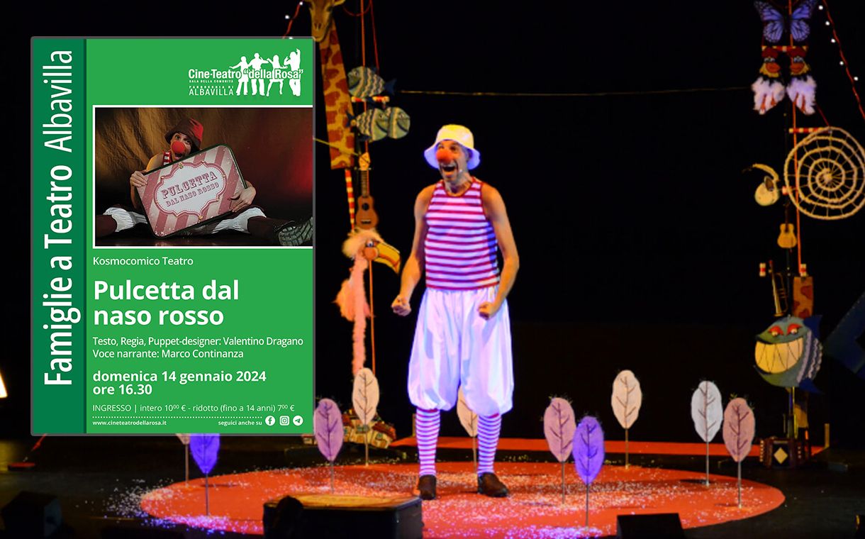Pulcetta é uno spettacolo per attore, teatro di figura, danza e musica dal vivo. La particolarità della messa in scena sta nel fatto che i pupazzi, gli oggetti, il mare, il paese con le luminarie a festa, appaiono dal costume, anzi che ogni animale, ogni personaggio, ogni luogo, è un misto di corpo danzante e sagome manipolate a vista, in un mix sorprendente di teatro visuale e movimento corporeo. Sulla scena si rincorrono danze, musiche, canzoni, testi comici e poetici alla ricerca del proprio naso rosso, della propria casa, del proprio posto nel mondo. In fondo é la parabola del viaggio che ognuno di noi, che sia bambino o adulto, fa, per crescere.