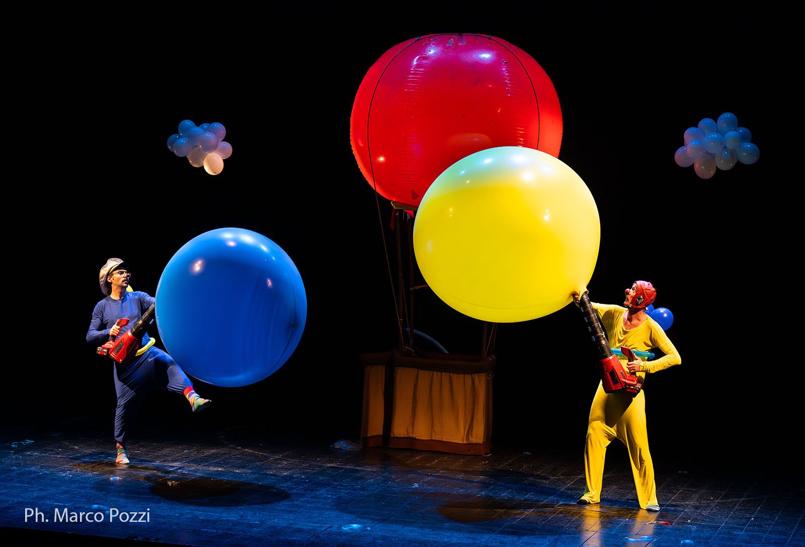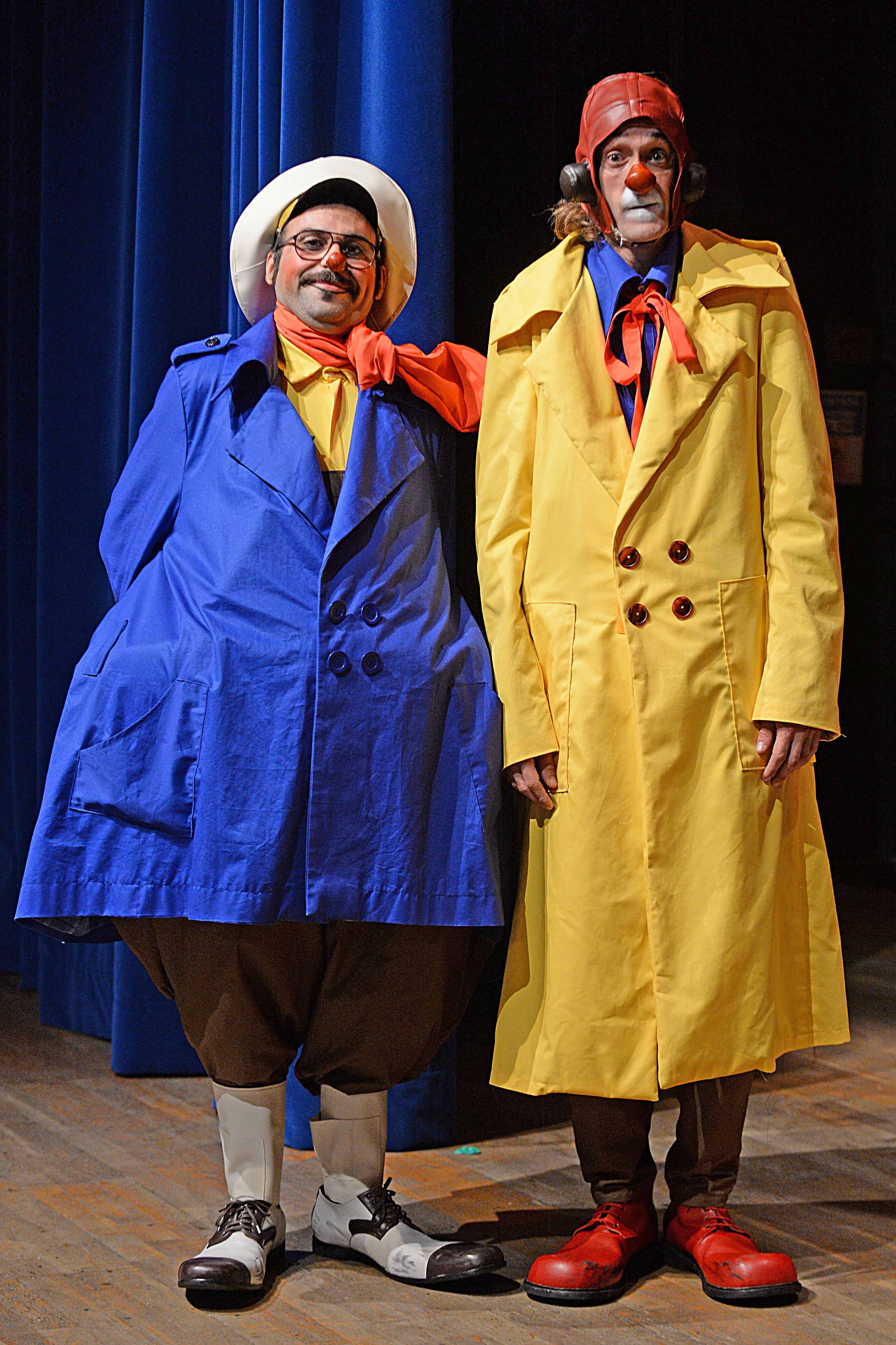 Indossano abiti colorati e accessori della tradizione del clown circense, scarpe lunghe e naso rosso. Nello spettacolo sono presenti diverse tecniche tra cui manipolazione di palloncini, giocoleria, numero dell'uomo nel pallone, pantomima.
